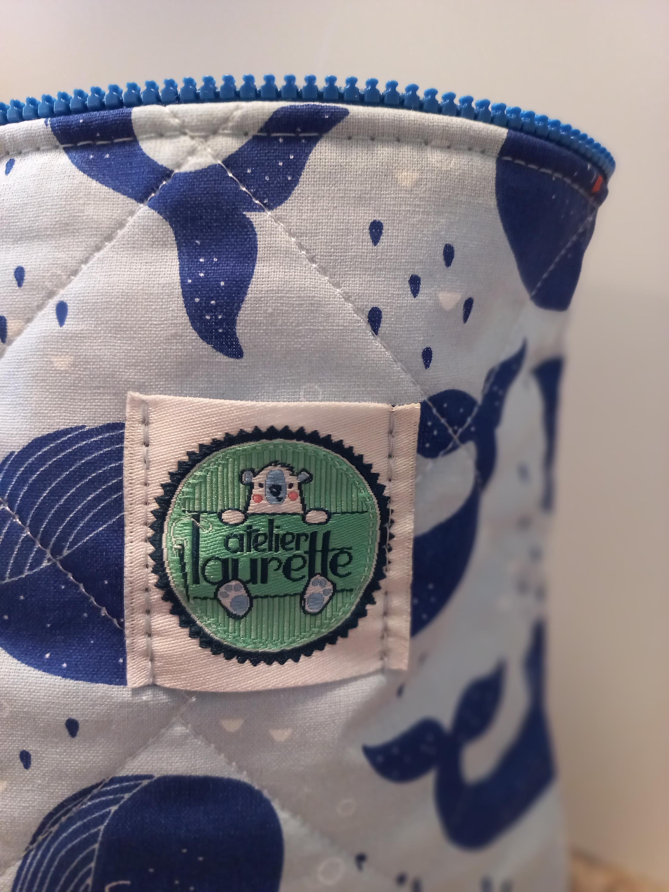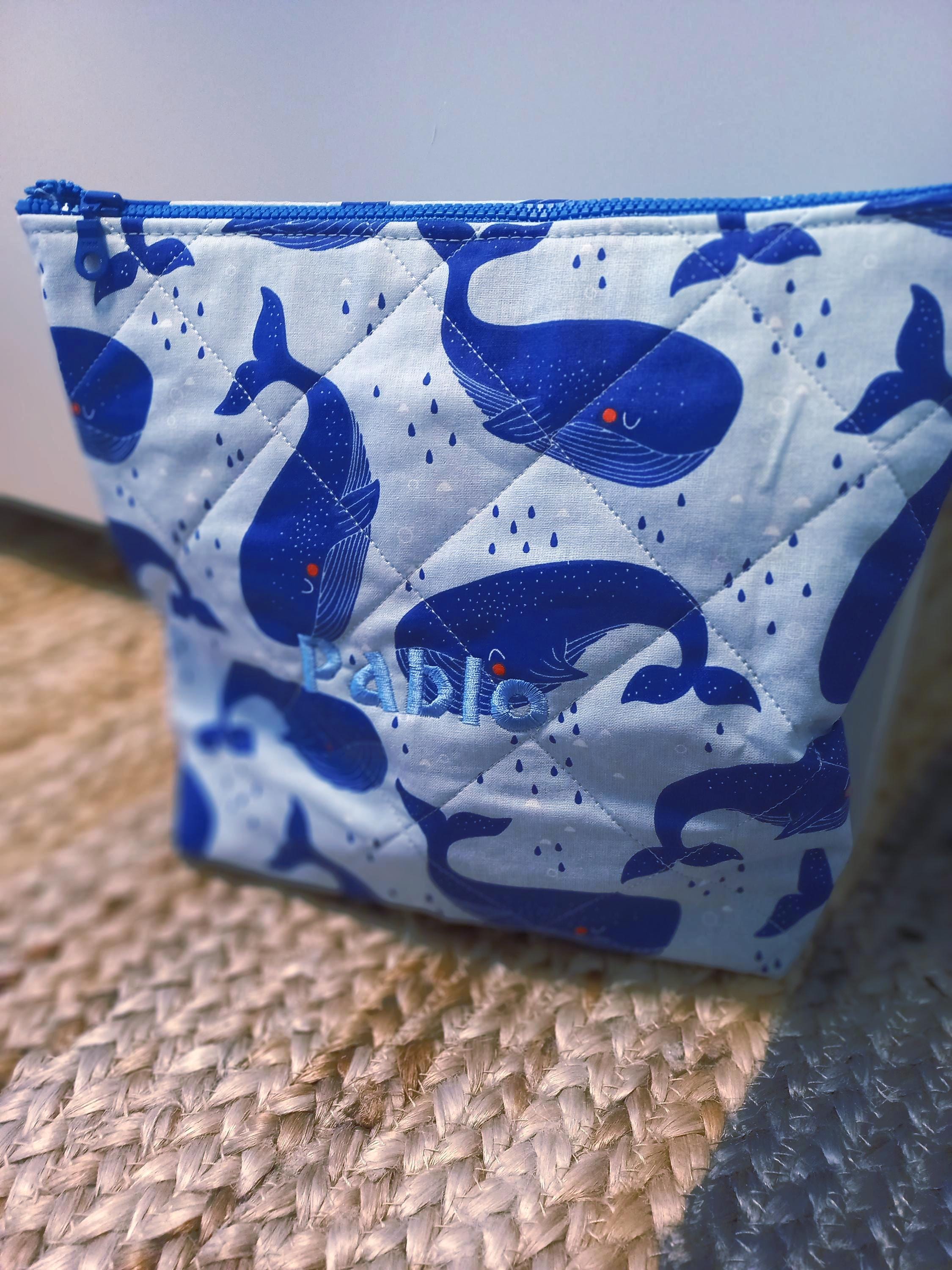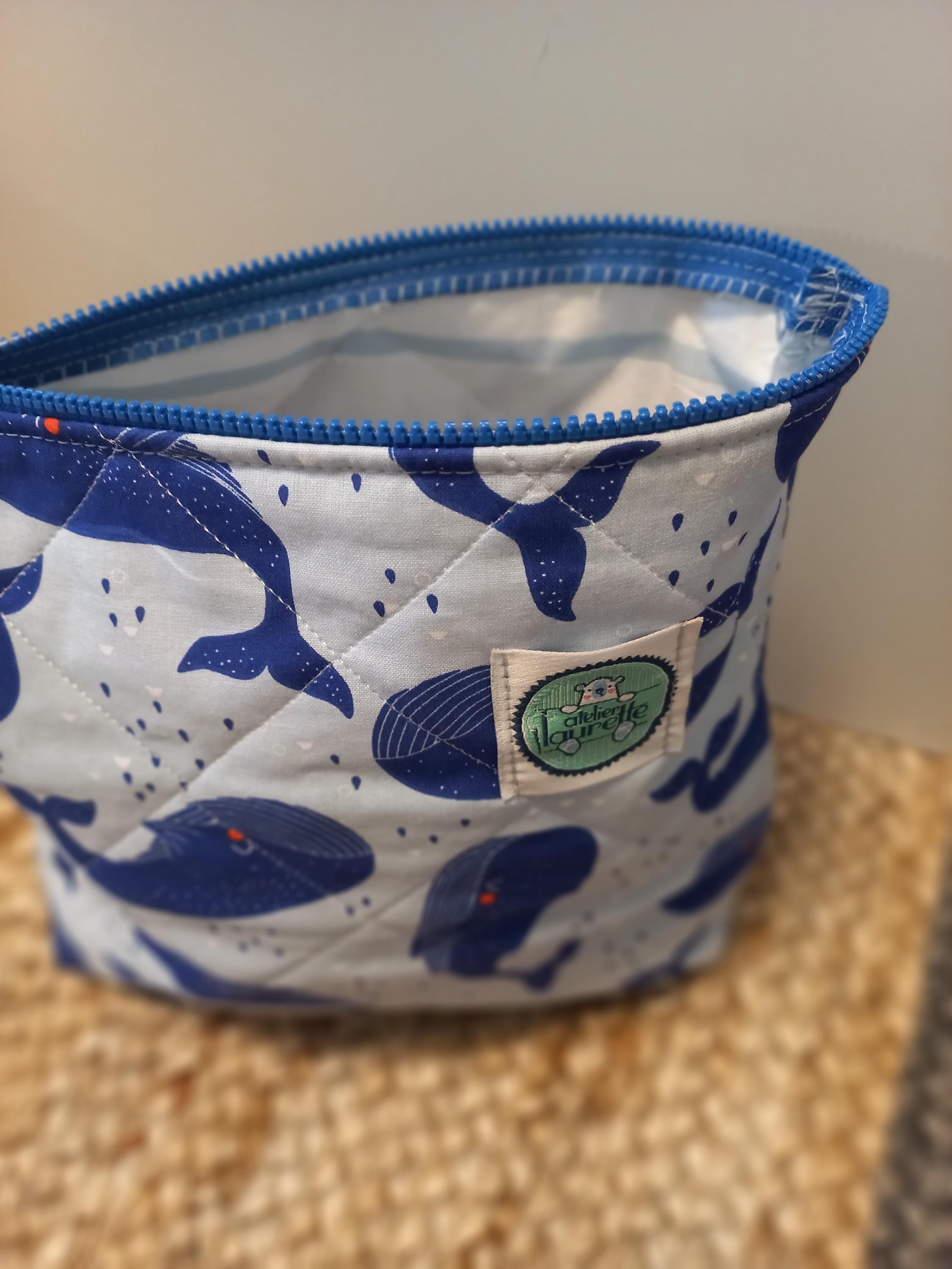 Une petite pochette ouatée pour enfants avec un motif baleines bleues à l'extérieur et des rayures bleu ciel à l'intérieur.