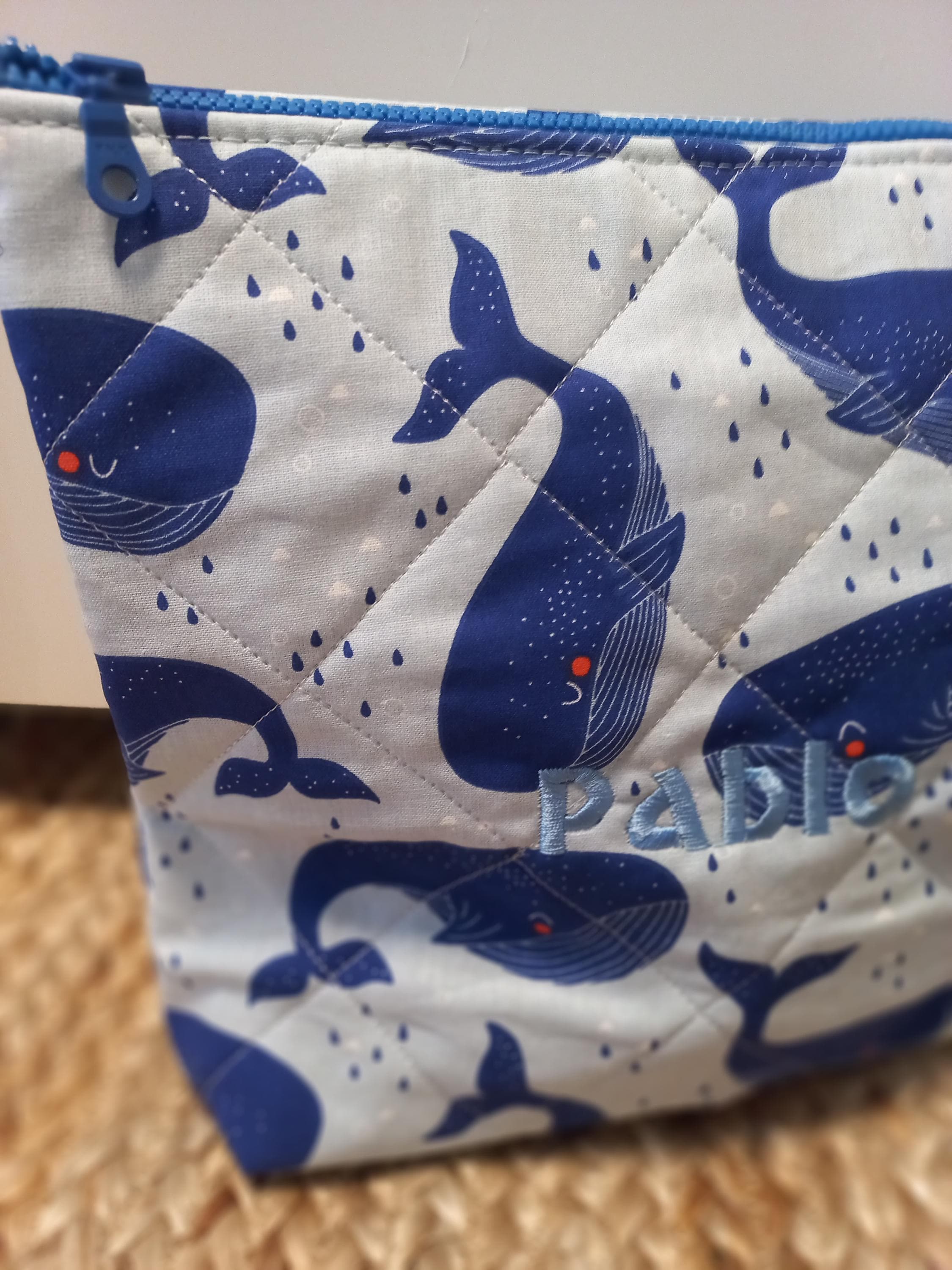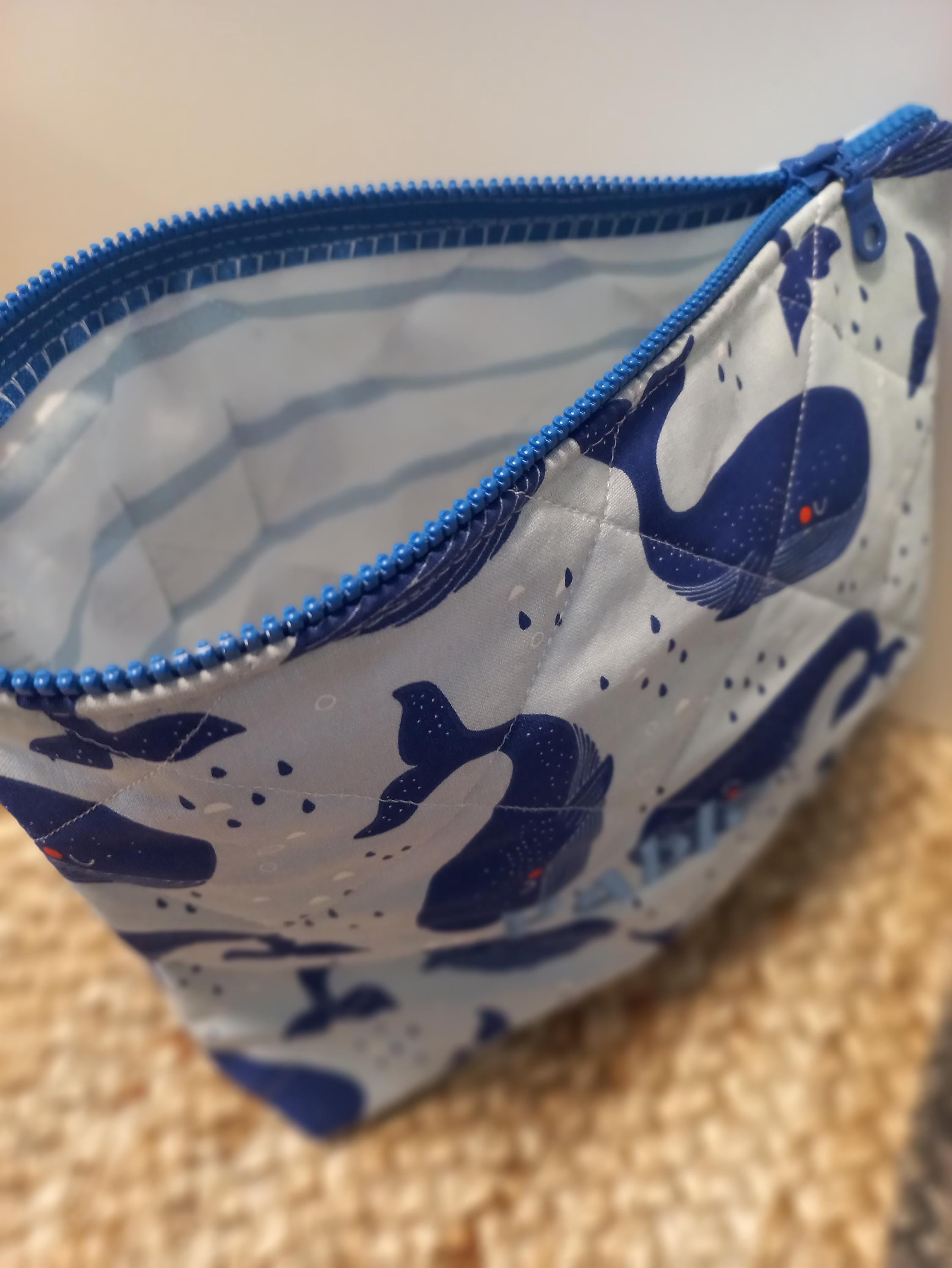 Süßer Kinderbeutel mit Walen außen und hellblauen Streifen innen.